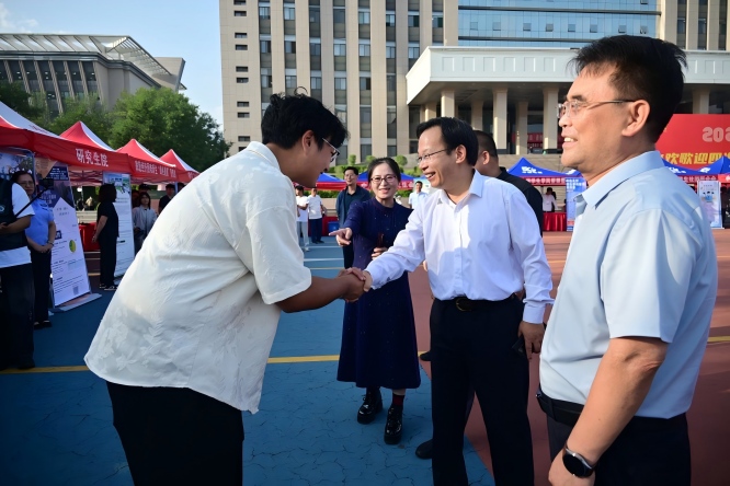 校党委书记张晓永在宣传推介活动现场,与参加我校与澳门科技大学2024年秋季交换项目返校代表、材料学院23级学生刘畅同学亲切握手,并详细询问交换项目的具体情况。国际教育学院院长赵宇宏向张晓永书记简要汇报了我校目前国际交流合作项目的开展情况以及近期取得的成果。张书记认真聆听,不时点头表示肯定,为学校国际交流合作项目的未来发展指明了方向。