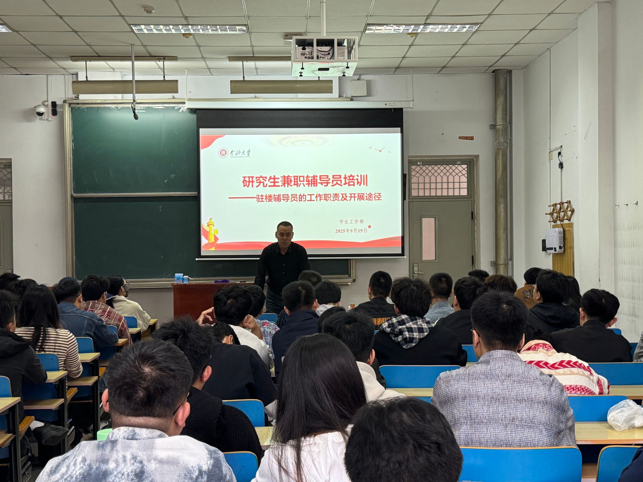 为强化研究生兼职辅导员职责意识与应急处置能力,充分发挥其“学院辅助带班+公寓驻楼”双重职能,学生工作部于9月19日在11211H教室举办研究生兼职辅导员驻楼工作专项培训,全校101名研究生兼职辅导员参训。