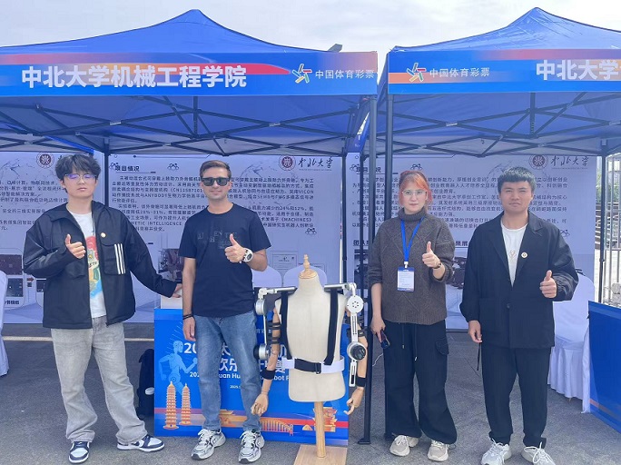 为推动太原市机器人产业创新发展,9月20日,2025太原人形机器人欢乐跑暨人工智能成果展示活动在晋阳湖公园举行。活动由太原市政府主办,市体育局、市科技局承办。中北大学机械工程学院秦慧斌老师应邀,与五位研究生包括3名来华留学研究生,携带山西省回国留学人员科研资助项目创新成果“主被动混合式可穿戴上肢助力外骨骼机器人”参加了人工智能成果展示活动。