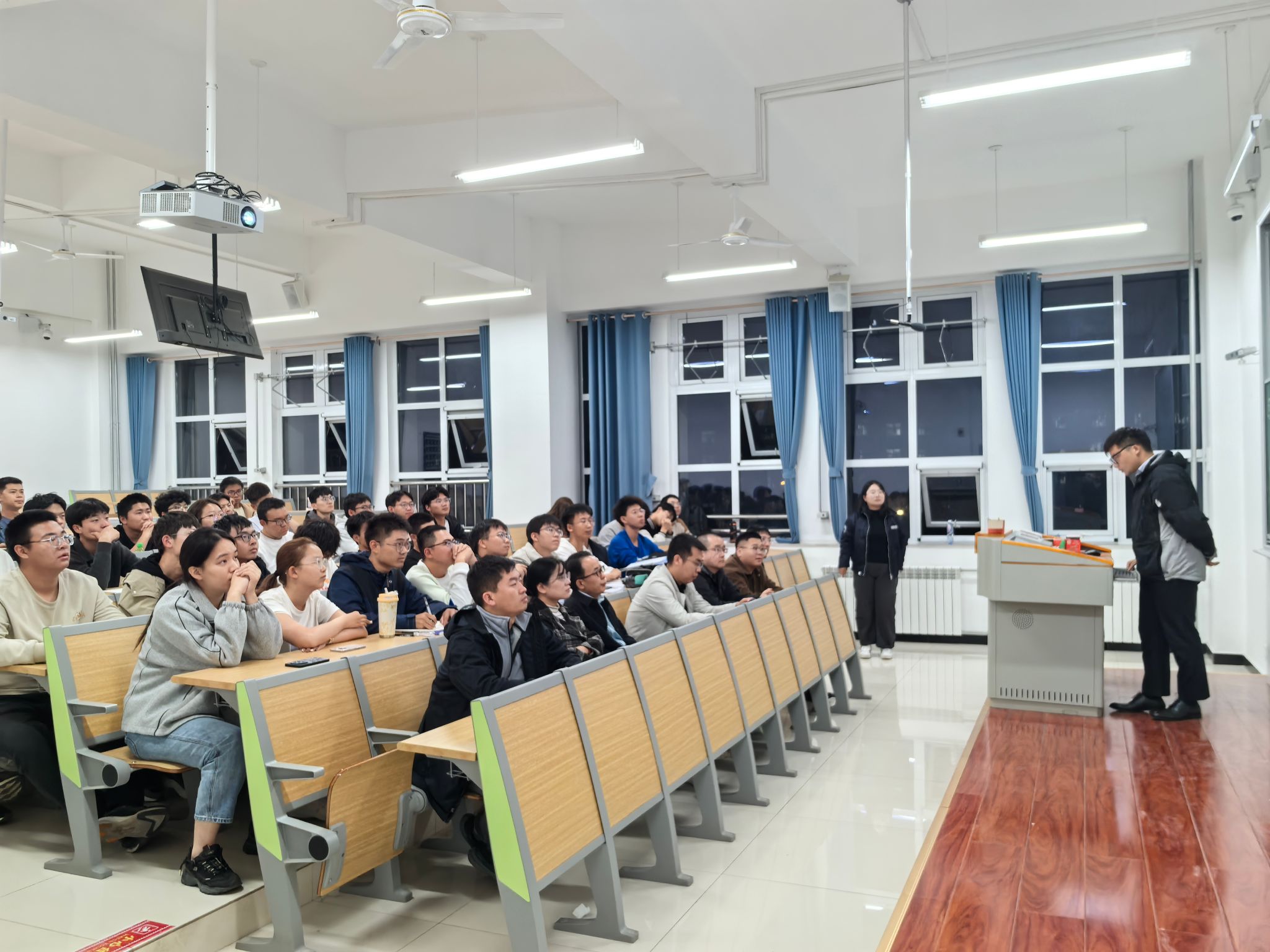 在交流互动环节,专业教师与同学们积极对话,现场气氛热烈。杨晓东耐心细致地回答了同学们关于职业规划、能力提升、行业需求等方面的提问,鼓励新生夯实专业基础,勇于创新实践,积极投身先进制造领域。