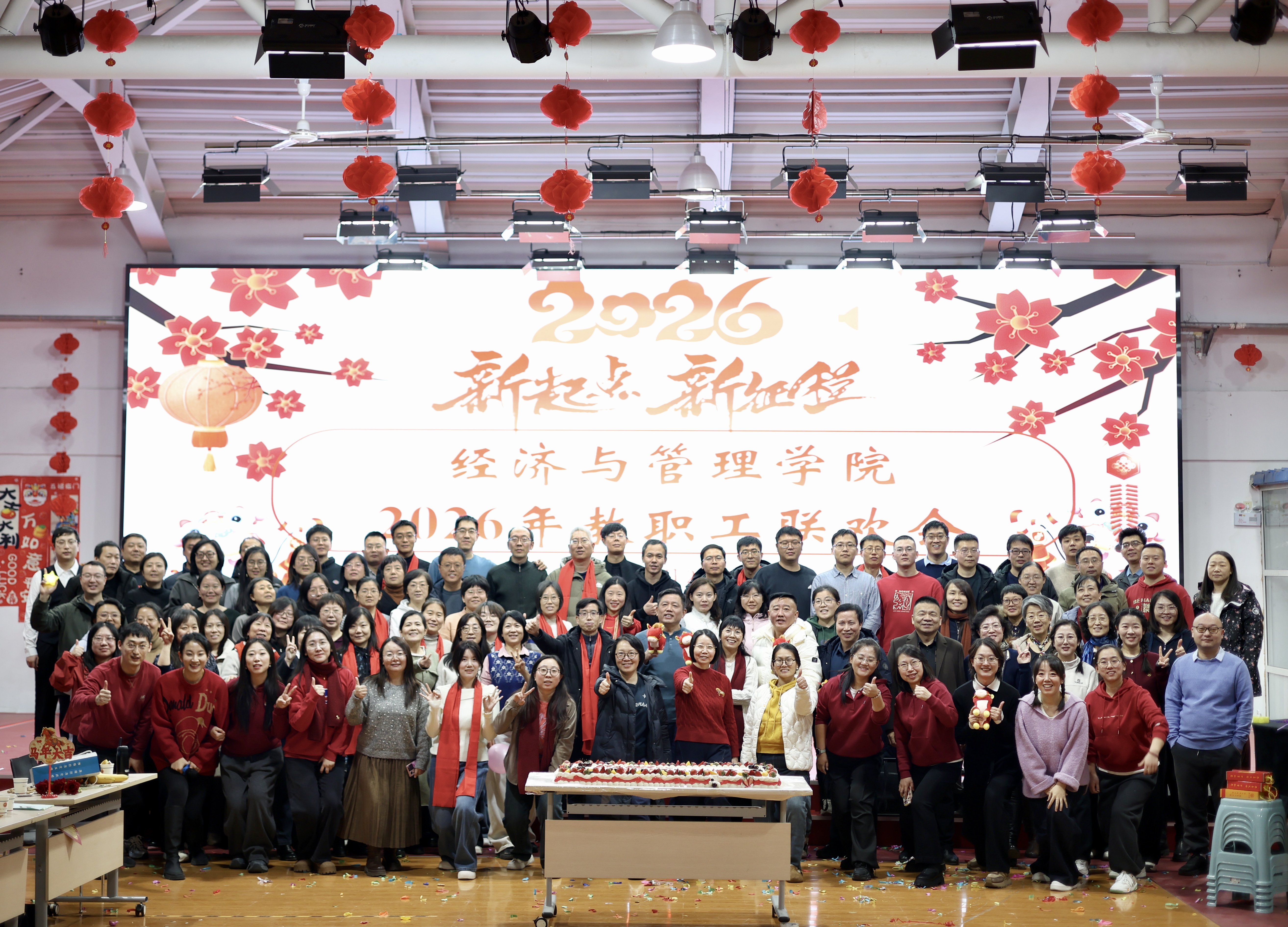 岁序更替,华章日新;欢歌聚首,共启新篇。为进一步凝聚人心、鼓舞干劲,营造温馨和谐、积极向上的学院文化氛围,1月20日下午,经济与管理学院“凝心聚力启新程 欢歌逐梦向未来”2026年教工联欢会在学校离退休工作部活动中心温情上演。学院全体教职工齐聚一堂,以艺术承载情谊,以欢笑共叙发展,在轻松愉悦的氛围中共迎新春、共绘蓝图。