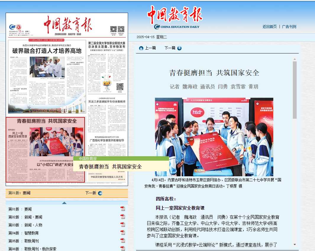 本报讯(记者 魏海政 通讯员 闫勇)在第十个全民国家安全教育日来临之际,齐鲁工业大学、中山大学、中北大学、吉林师范大学4所高校跨区域联动创新,利用现代网络技术打造云端课堂,3万余名师生共同参与了这堂国家安全教育课。