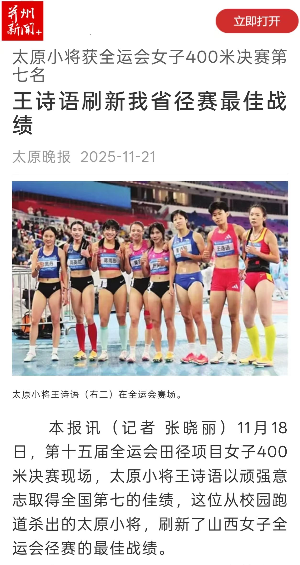 本报讯(记者 张晓丽)11月18日,第十五届全运会田径项目女子400米决赛现场,太原小将王诗语以顽强意志取得全国第七的佳绩,这位从校园跑道杀出的太原小将,刷新了山西女子全运会径赛的最佳战绩。