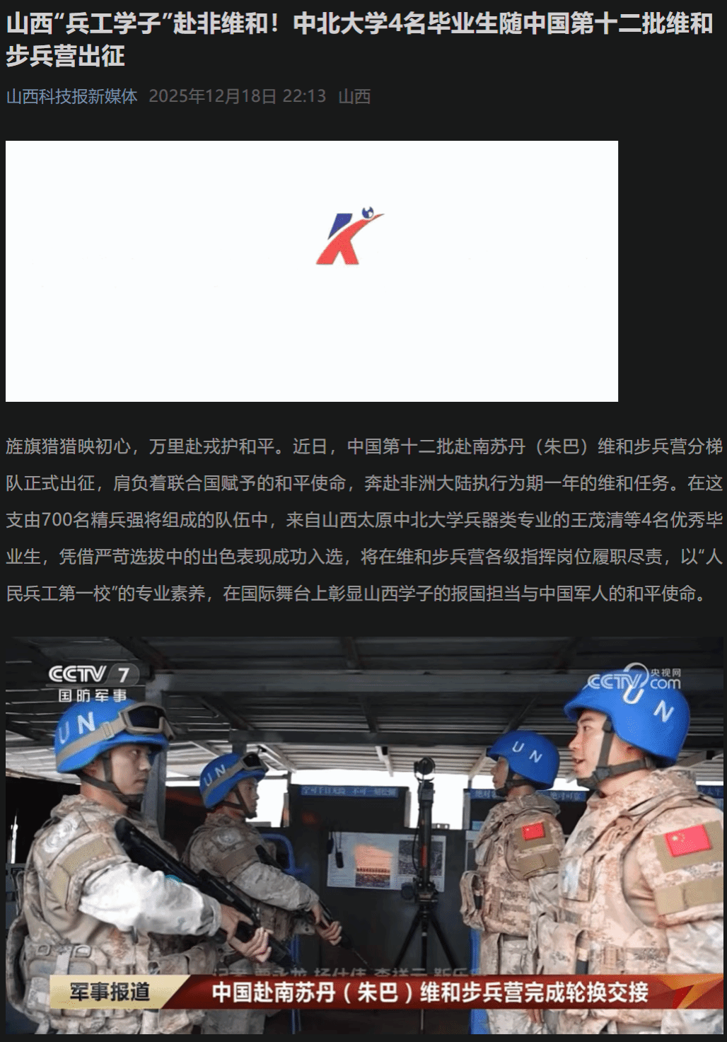 旌旗猎猎映初心,万里赴戎护和平。近日,中国第十二批赴南苏丹(朱巴)维和步兵营分梯队正式出征,肩负着联合国赋予的和平使命,奔赴非洲大陆执行为期一年的维和任务。在这支由700名精兵强将组成的队伍中,来自山西太原中北大学兵器类专业的王茂清等4名优秀毕业生,凭借严苛选拔中的出色表现成功入选,将在维和步兵营各级指挥岗位履职尽责,以“人民兵工第一校”的专业素养,在国际舞台上彰显山西学子的报国担当与中国军人的和平使命。