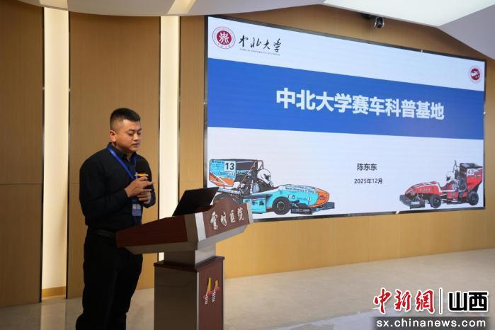 在山西科普工作交流会上,中北大学赛车科普基地负责人陈东东发言。王智超 摄 中北大学赛车科普基地于2004年创建学生团队萌芽,2023年获批山西省科普基地,2025年同时获评山西省高校综合性教育实践体验基地和中国汽车工程学会汽车科普教育基地。