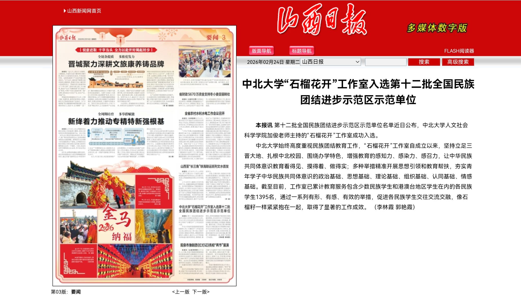 【山西日报】中北大学“石榴花开”工作室入选第十二批全国民族团结进步示范区示范单位