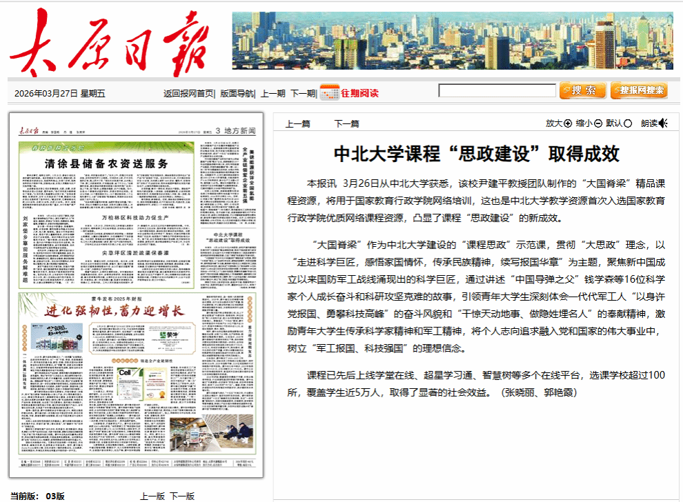 本报讯 3月26日从中北大学获悉,该校尹建平教授团队制作的“大国脊梁”精品课程资源,将用于国家教育行政学院网络培训,这也是中北大学教学资源首次入选国家教育行政学院优质网络课程资源,凸显了课程“思政建设”的新成效。
