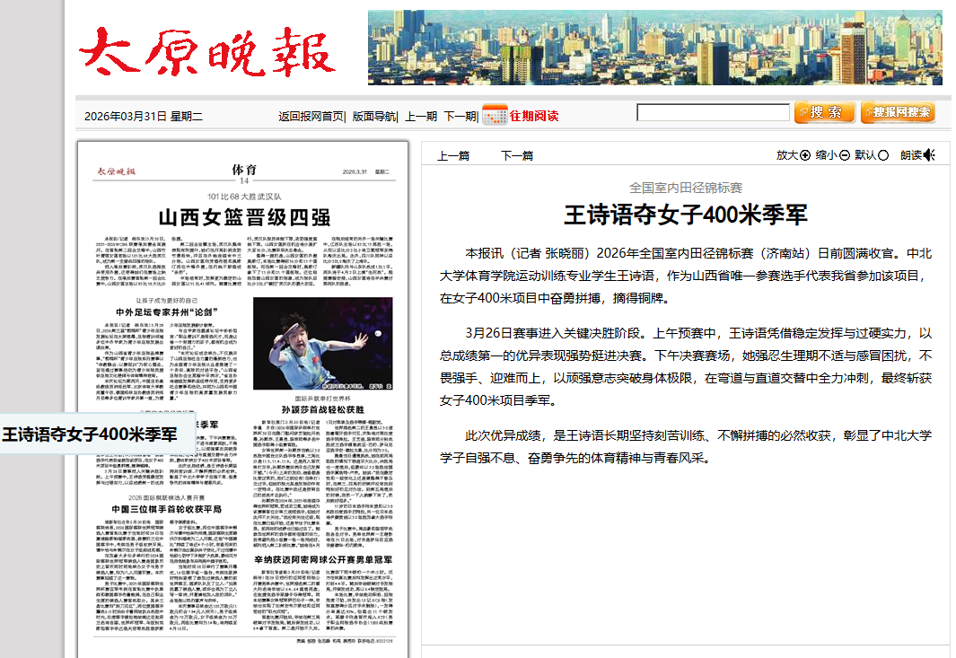 本报讯(记者 张晓丽)2026年全国室内田径锦标赛(济南站)日前圆满收官。中北大学体育学院运动训练专业学生王诗语,作为山西省唯一参赛选手代表我省参加该项目,在女子400米项目中奋勇拼搏,摘得铜牌。