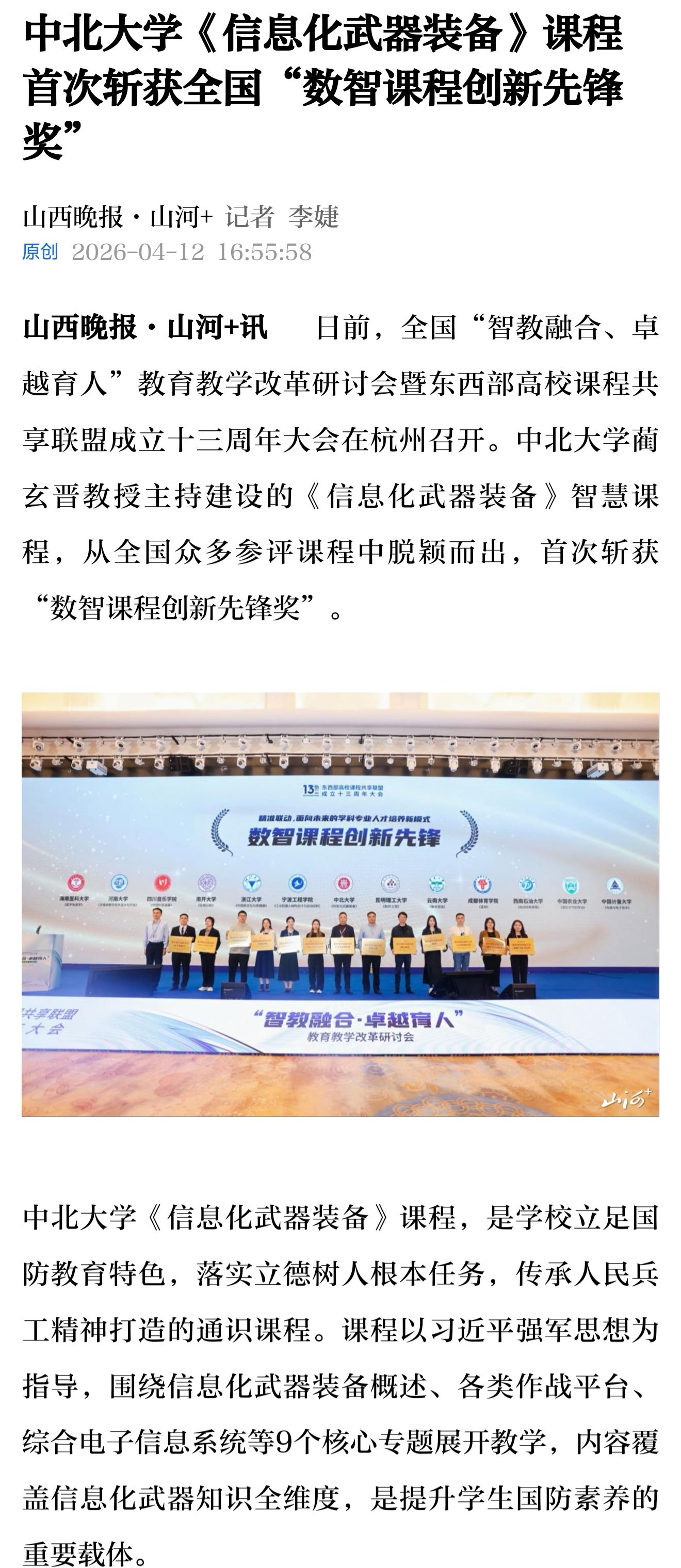 【山西晚报客户端】中北大学《信息化武器装备》课程首次斩获全国“数智课程创新先锋奖”