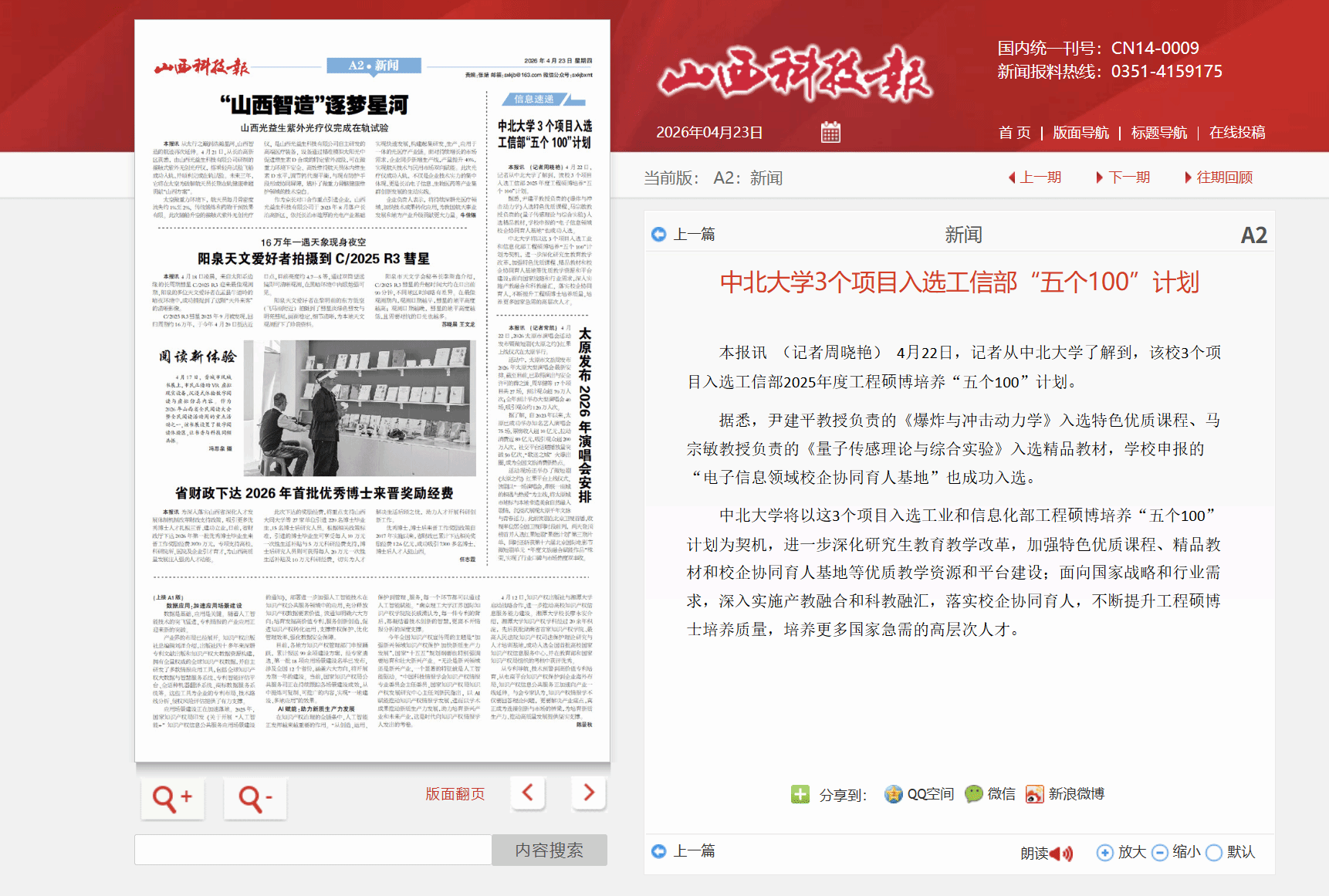 【山西科技报】中北大学3个项目入选工信部“五个100”计划