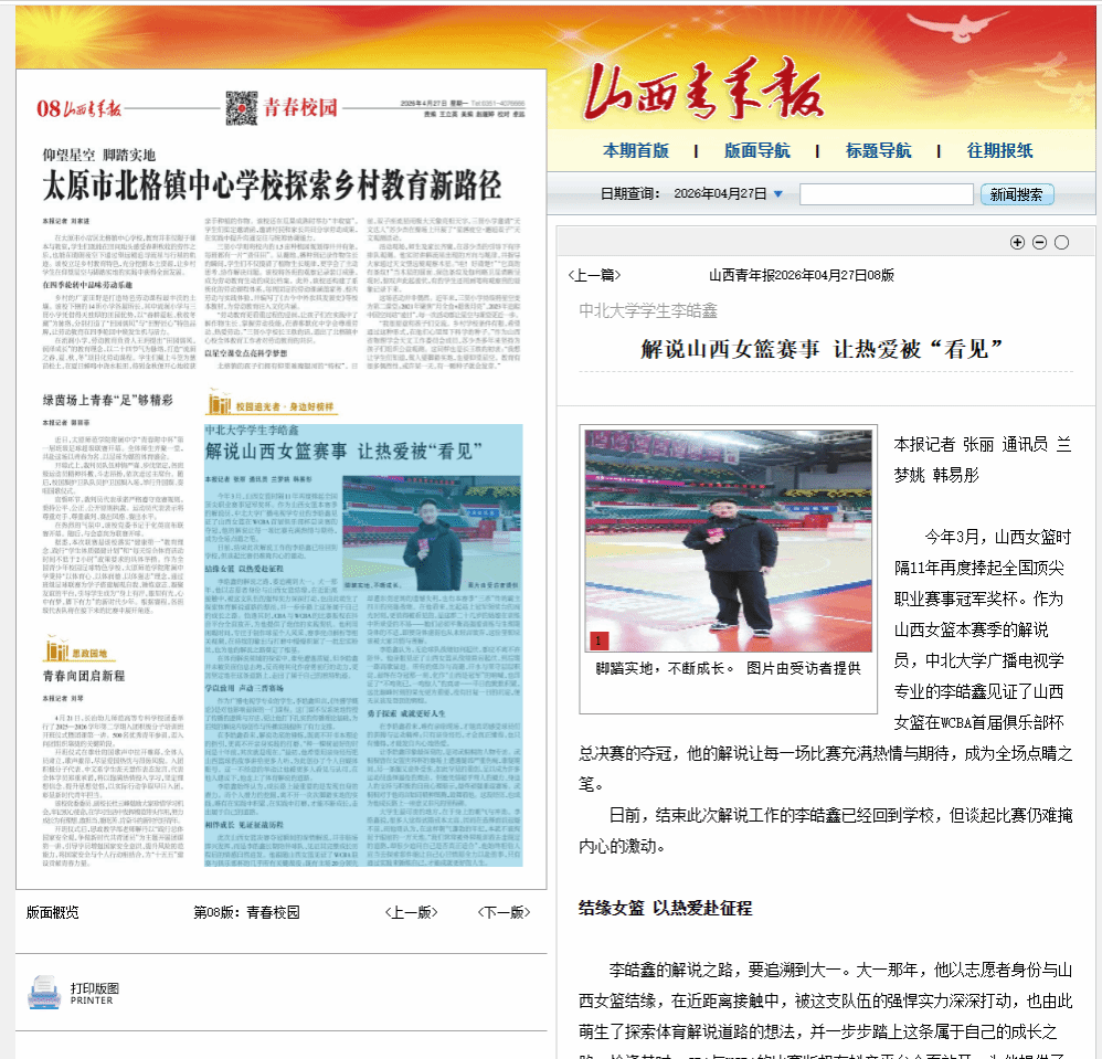 【山西青年报】中北大学学生李皓鑫 解说山西女篮赛事 让热爱被“看见”