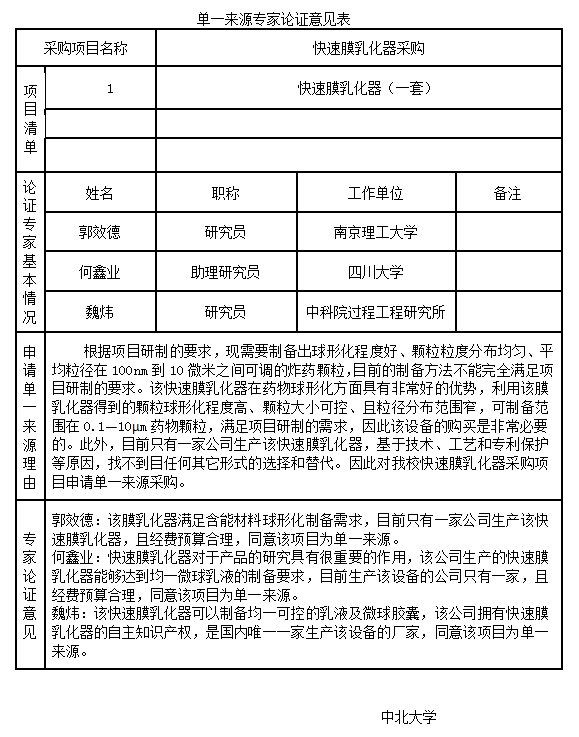 中北大学快速膜乳化器采购单一来源征求意见公示