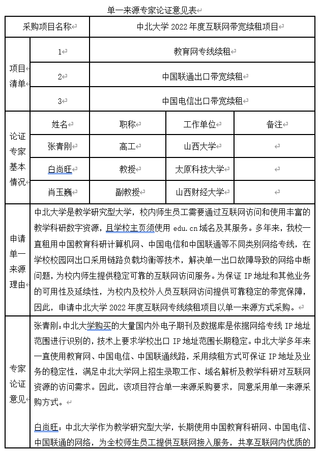 中北大学是教学研究型大学,校内师生员工需要通过互联网访问和使用丰富的教学科研数字资源,且学校主页须使用edu.cn域名及其服务。多年来,我校一直租用中国教育科研计算机网、中国电信和中国联通等不同类别网络专线,在学校校园网出口采用链路负载均衡等技术,解决单一出口故障导致的网络中断问题,为校内师生提供稳定可靠的互联网访问服务。为保证IP地址和其他业务的可用性及延续性,为校内及校外人员互联网访问提供可靠稳定的带宽保障,因此,申请中北大学2022年度互联网专线续租项目以单一来源方式采购。