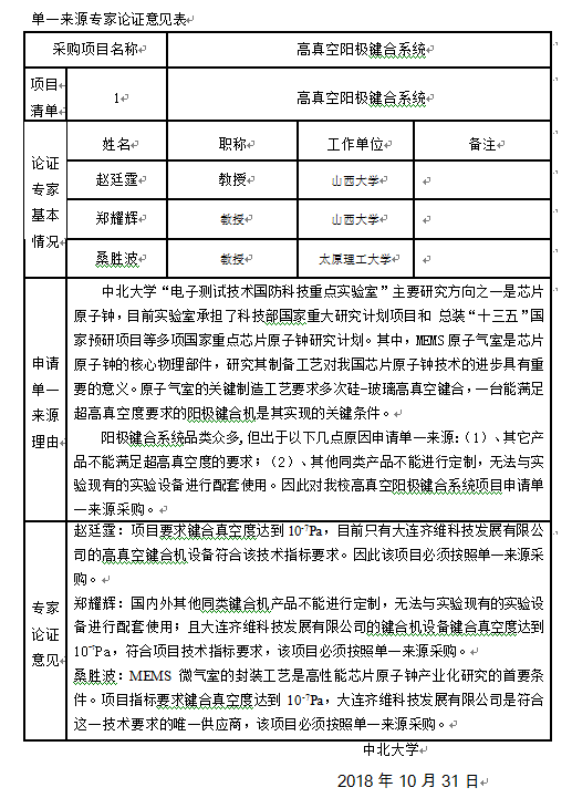 中北大学高真空阳极键合系统单一来源征求意见公示