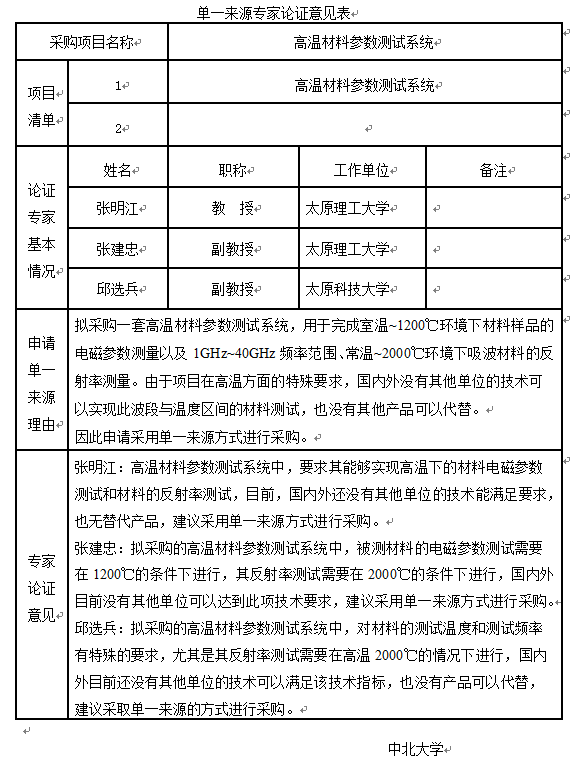 中北大学高温材料参数测试系统单一来源征求意见公示