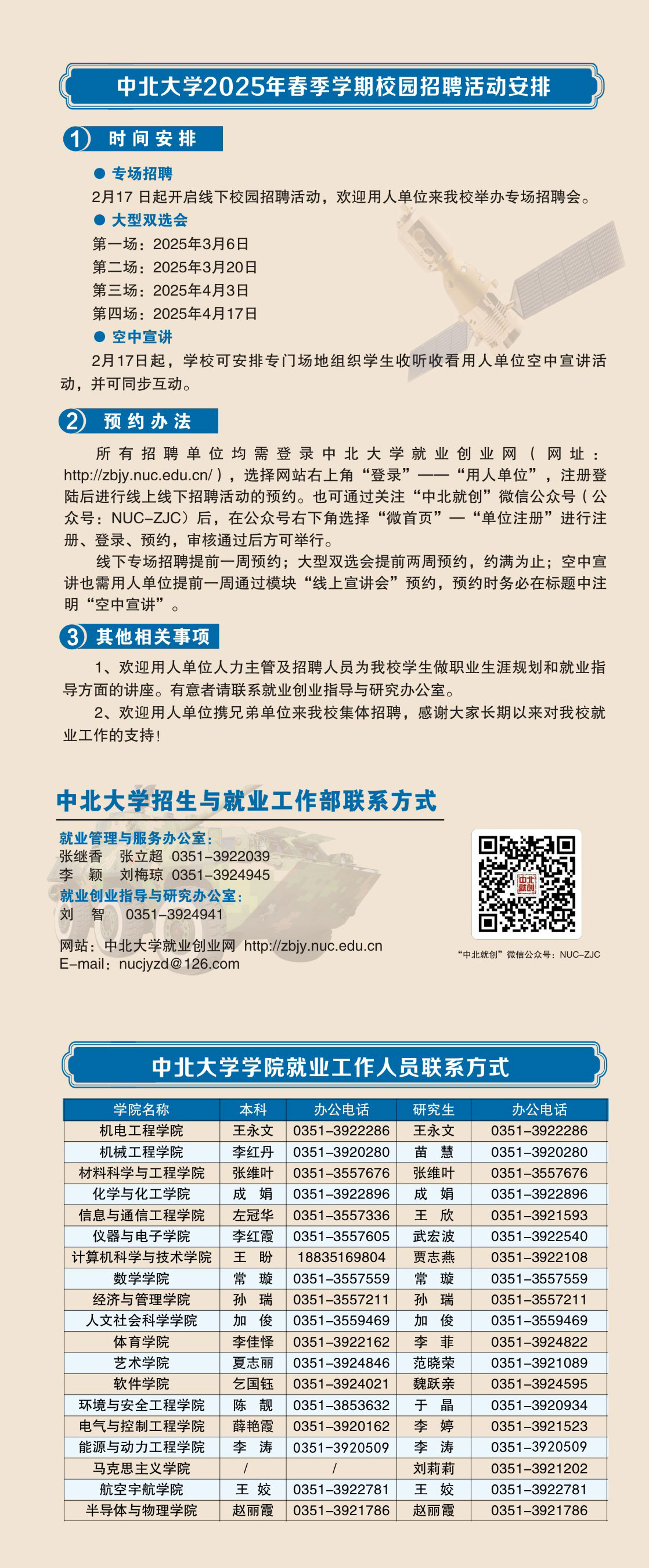 中北大学2025年春季学期校园招聘活动安排及就业工作人员联系方式