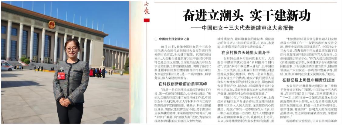 我校材料科学与工程学院赵宇宏教授作为中国妇女十三大代表,光荣参加此次盛会,认真学习大会报告,并应邀在《中国妇女报》发表“在科技创新最前沿勇攀高峰”感言: “我是一名长期埋头实验室的科技工作者,第一次参加巾帼盛会,心情无比激动。科研之路道阻且长,需要女性发挥坚忍不拔、勇于担当和自我奉献的精神,未来将继续啃‘硬骨头’,破‘卡脖子’难题,向“星辰大海”进发,为加快实现高水平科技自立自强注入女性力量。”
