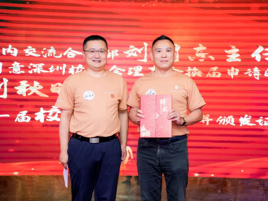 会议宣读了“关于同意深圳校友会理事会换届申请的批复”,正式任命刘秋明为新一届深圳校友会会长并颁发证书。