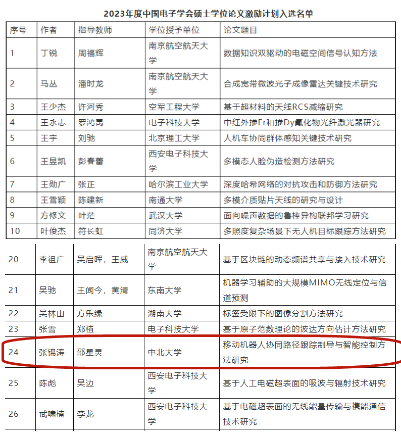 1月12日,中国电子学会公布了“2023年度中国电子学会硕士学位论文激励计划”(中国电子学会优秀硕士论文)遴选结果,经过形式审查、专家函审和专家会审等程序,拟确定25篇博士学位论文和43篇硕士学位论文入选。我校电气与控制工程学院邵星灵教授指导的硕士论文《移动机器人协同路径跟踪制导与智能控制方法研究》(作者:张锦涛)获评优秀硕士论文。这是我校首次获评中国电子学会优秀硕士论文,也是全省高校唯一获奖论文。