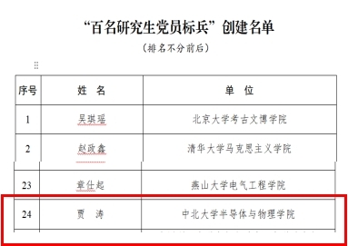 近日,教育部公布第三批全国高校“百个研究生样板党支部”和“百名研究生党员标兵”创建名单。经组织推荐、通讯评审、集中会审、结果公示等环节,遴选出100个研究生样板党支部和100名研究生党员标兵。我校半导体与物理学院博士研究生贾涛同学光荣入选第三批全国高校“百名研究生党员标兵”。这是我校学子首次荣获该项荣誉。