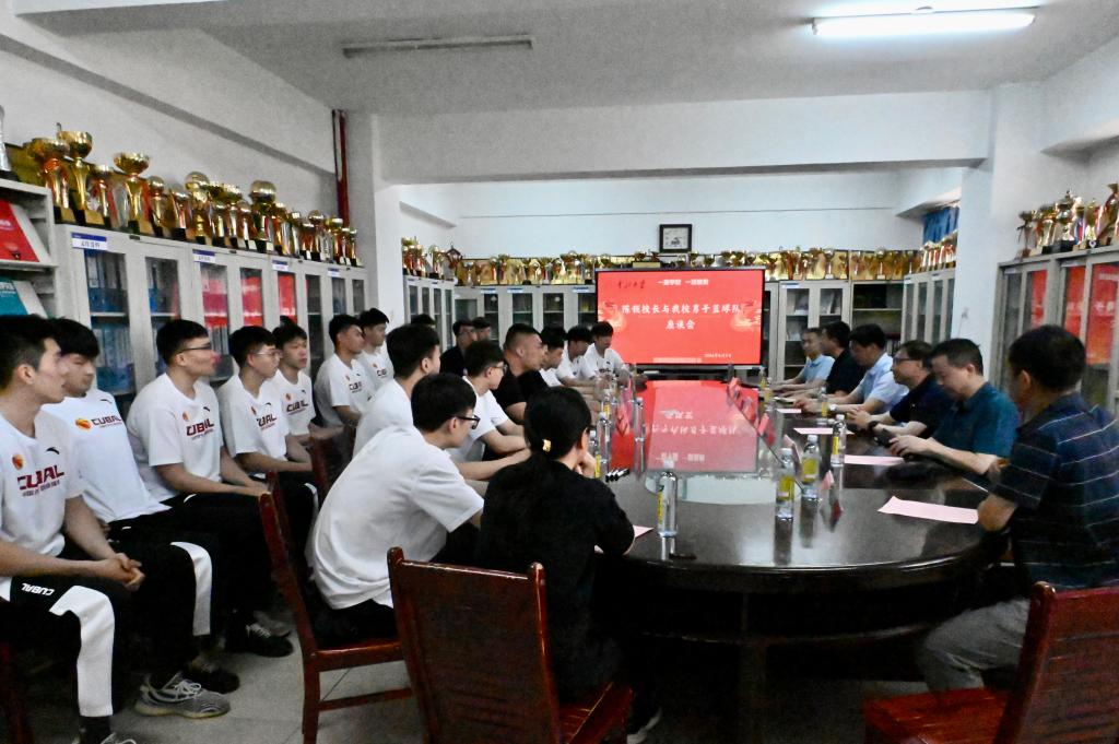 陈钱充分肯定了篮球队在比赛中展现出的竞技水平和精神风貌,高度赞扬了他们团结一致、敢打敢拼的锐气。他指出,体育运动事关学校建设发展及学生素质的全面提升,对强健体魄、锤炼学生意志品格影响深远。他表示,此次赛事自开赛以来,广受校内外师生的热切关注、支持和好评,队员们在赛场上的顽强拼搏已成为学校一道靓丽的风景线,成为展现当代大学生青春、阳光和活力的明信片。他表示,学校将在政策、资金等方面加大投入力度,全力保障篮球队后续比赛和训练,不遗余力为学生体育运动开展创造良好的条件。他希望队员们在学习、科研、生活中能够继续保持和发扬这种拼搏进取的精神,砥砺品格,增长才干,德智体美劳全面发展,努力成长为堪当强国建设、民族复兴大任的栋梁之材。