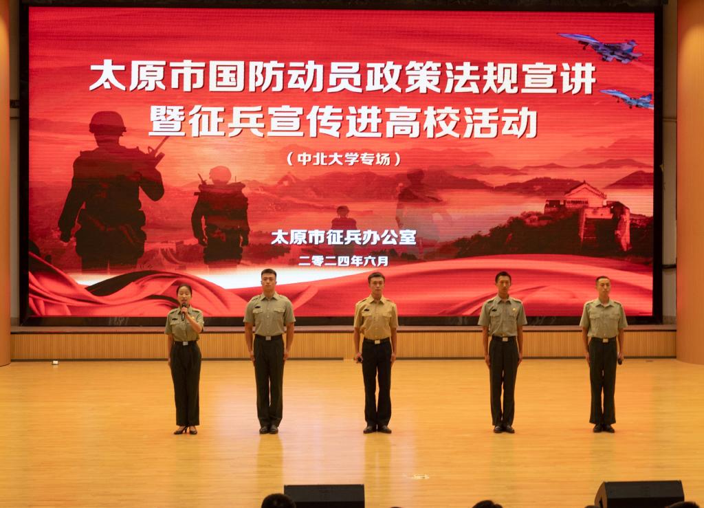 6月13日,“太原市国防动员政策法规宣讲暨征兵宣传进高校”活动在我校科艺苑举行。党委常委、副校长尹建平,尖草坪区人民武装部上校政治委员郑泽海出席活动。活动分退役复学大学生代表经历分享、国防动员政策法规解读、艺术表演及主题短片欣赏等多个环节。太原市征兵办公室、太原市委宣传部、太原市人民政府国防动员办公室、尖草坪区征兵办公室相关领导、我校各职能部门、学院负责人、优秀大学生军人代表等700余名师生参加活动。