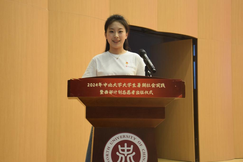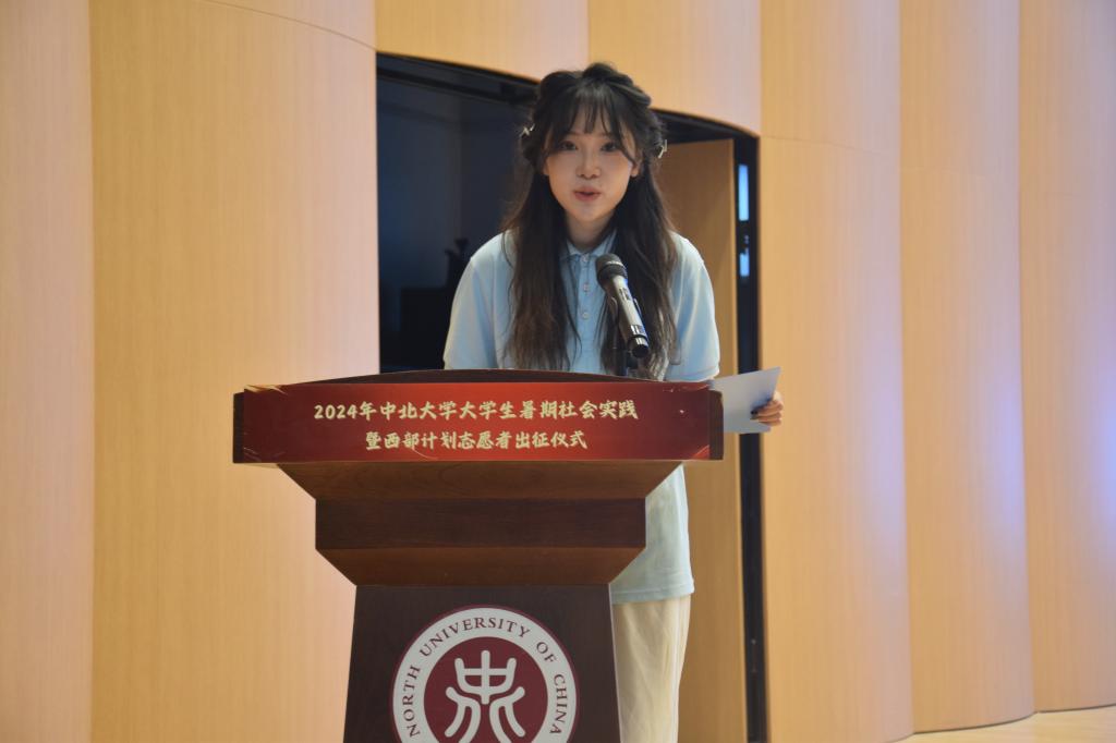 经济与管理学院的贾兰心代表2024年社会实践队员作表态发言。她表示,在暑期社会实践中,全体队员将在行动上厚植家国情怀,立志成为信念坚定的“志士”;在探索中创新实践方法,勇敢成为时代前进的“先锋”;在奉献中彰显人生价值,乐于成为强国建设的“栋梁”,起而行之、勇担重任,努力在祖国最需要的地方淬炼青春、茁壮成长。