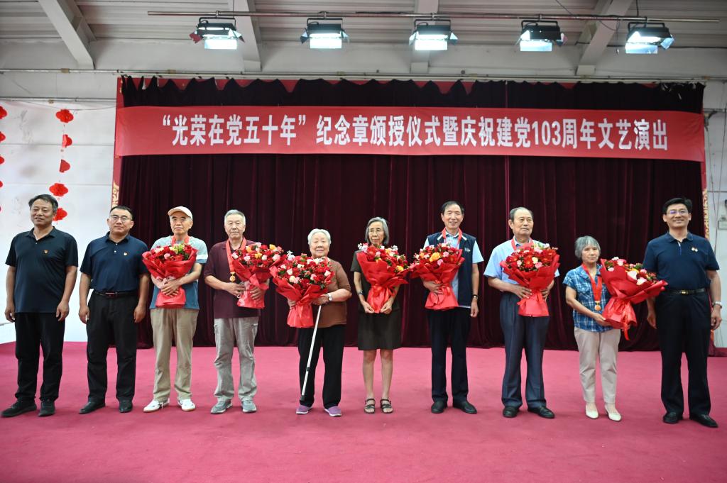 6月28日,我校“光荣在党五十年”纪念章颁授仪式在离退休工作部老年活动中心举行。今年,我校武岗、孙达成、刘进贤、何奇光、宋文杰、王英梅、常晓宝、王凤英、李生云9位老党员获得“光荣在党50年”纪念章。校党委党委、副校长来志斌出席并为现场老党员佩戴纪念章、献花并送上节日祝福。