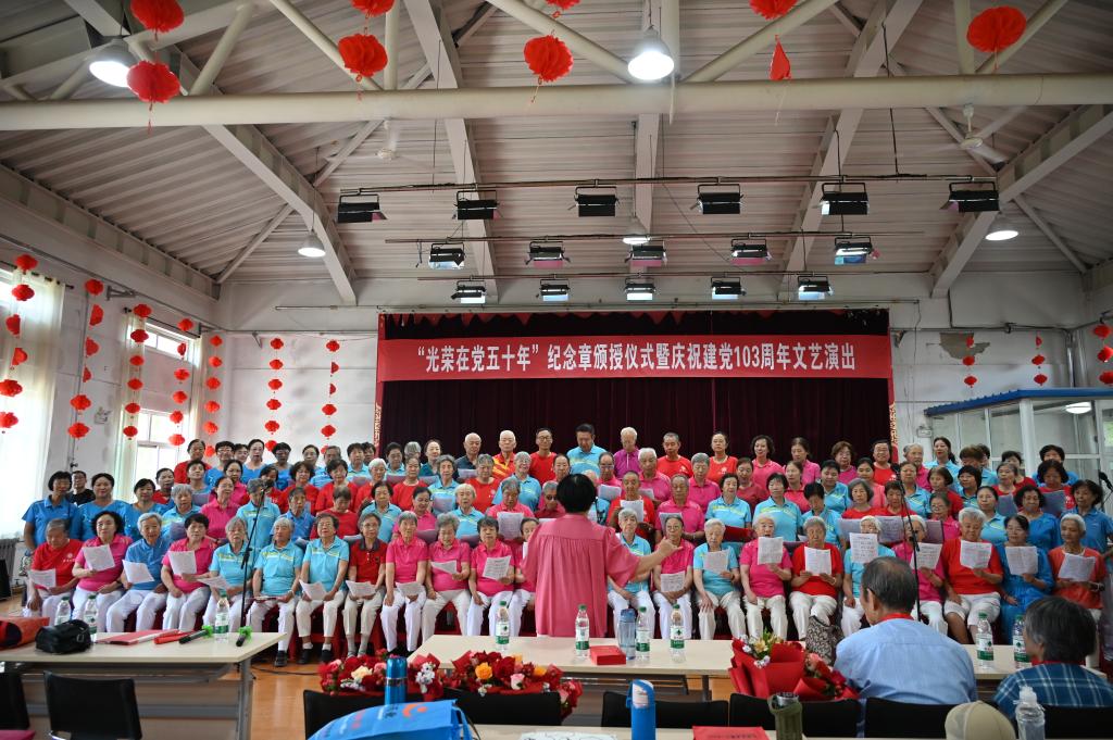 颁授仪式结束后,离退休工作部组织了专场离退休代表文艺演出,集体合唱《祖国不会忘记》《最美的歌唱给妈妈》等节目,展现了离退休老同志们昂扬向上的精神风貌和从容乐观的生活态度,赢得现场观众阵阵掌声。