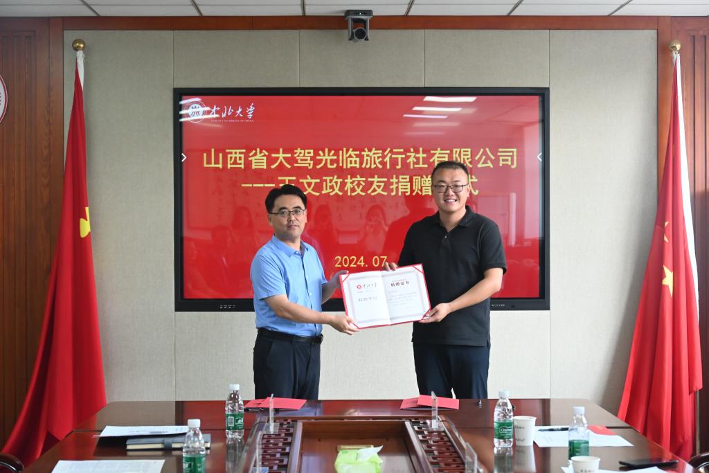 7月1日,我校校友、山西省大驾光临旅行社有限公司董事长王文政来校,向母校慷慨捐赠150万元,资金主要用于我校师生创新创业、就业指导和大学生实践、校史研究工作。副校长尹建平出席捐赠仪式并代表学校为王文政校友颁发捐赠证书。我校教育发展基金会理事长薛实军与王文政分别代表双方签订了捐赠协议,与会领导共同见签。