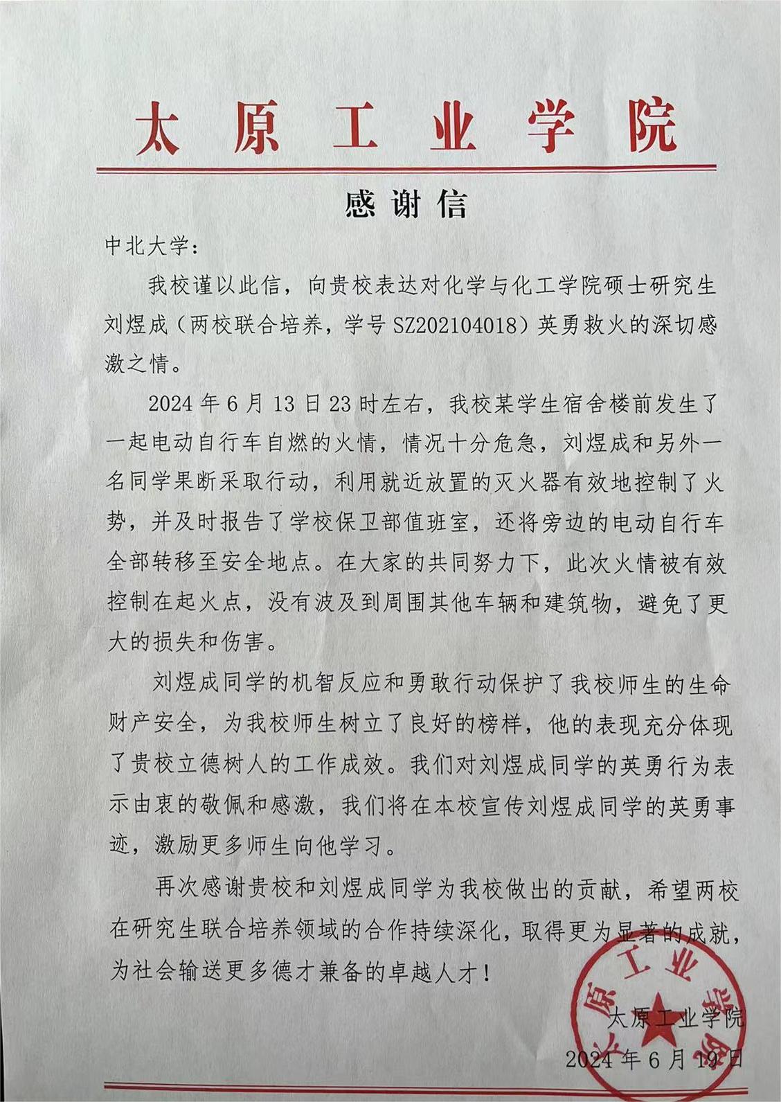 “刘煜成同学的机智反应和勇敢行为保护了我校师生的生命财产安全,为我校师生树立了良好的榜样。他的表现充分体现了贵校立德树人的工作成效,我们对刘煜成同学的英勇行为表示由衷的敬佩和感激,我们将在本校宣传刘煜成同学的英勇事迹,激励更多师生向他学习。”近日,我校收到太原工业学院发来的感谢信,对我校化学与化工学院21级硕士研究生刘煜成同学面对突发火情及时采取措施,成功扑灭电动自行车自燃火情、避免更大损失的英勇行为表达了感激之情。