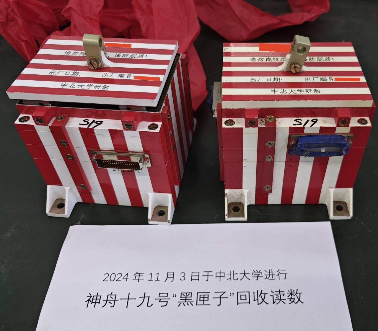 北京时间2024年10月30日4时27分,搭载神舟十九号载人飞船的长征二号F遥十九运载火箭在酒泉卫星发射中心点火发射,约10分钟后,飞船与火箭成功分离,进入预定轨道,航天员乘组状态良好,发射取得圆满成功。11月3日,由我校研制、跟随长征二号F遥十九运载火箭一起执行此次发射任务的两个“黑匣子”回收后送回学校,经相关科研人员第一时间完成数据读取,完整获取了火箭飞行过程中的多路图像及力学参数数据。标志着我校科研成果再次成功助力神舟十九号发射任务圆满完成。