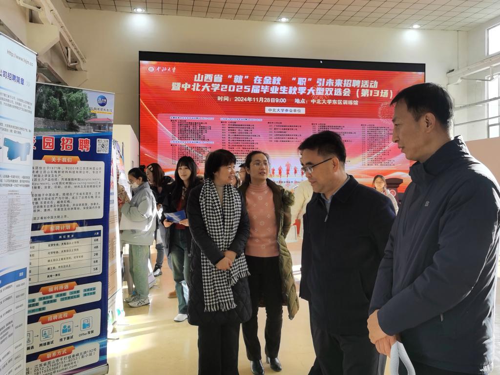 为落实党中央、国务院和省委、省政府关于高校毕业生就业工作决策部署,按照省教育厅关于开展2025届高校毕业生“秋季校园招聘月”系列活动通知要求,在学校前期布置安排的工作基础上扩充丰富,迅速组织开展系列活动。11月28日上午,山西省“就”在金秋“职”引未来招聘活动暨中北大学2025届毕业生大型双选会在东区训练馆举行。省教育厅学生处处长武振杰到双选会现场指导,同时调研学校就业创业服务基地建设情况,副校长尹建平陪同调研。省教育发展服务中心、省教育厅学生处及我校招生与就业工作部相关负责同志参加调研。
