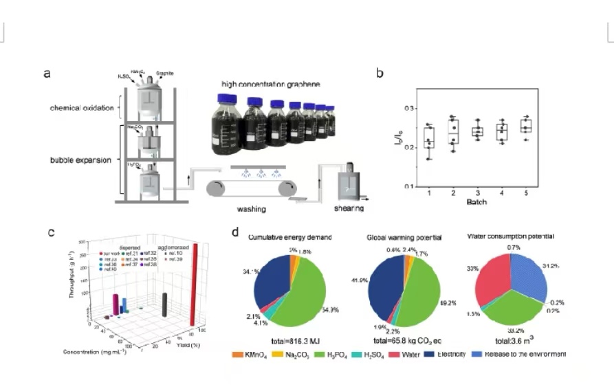 文章报道了石墨烯领域的最新研究成果,结合胶体化学体积排斥作用和二维纳米材料剥离新方法,发展了一种低成本、绿色环保、高产率、高品质石墨烯宏量制备方法,不仅为石墨烯产业发展提供低成本、高品质石墨烯提供了可能性,且为制备其他高浓度二维纳米片状材料提供了新的思路。