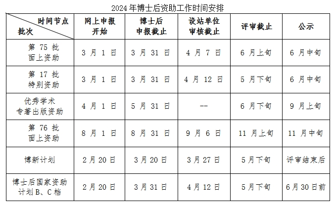 我校博士后可申报的基金、博士后资助计划类别及申报时间见下表。