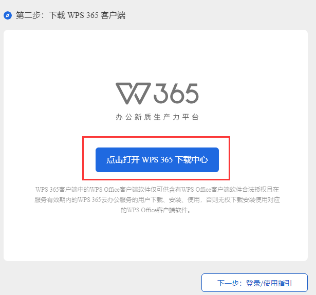 第二步:下载并安装WPS 365教育高级版客户端,Windows端用户请点击下方按钮下载,移动端及MAC端请在各自应用商店中搜索“WPS”下载安装,然后登录校园账号使用。