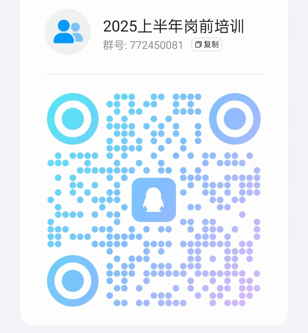 请各单位及时通知本单位教师,加入新入职教师2025上半年岗前培训QQ群:772450081,后续考试时间地点将在QQ群中通知。