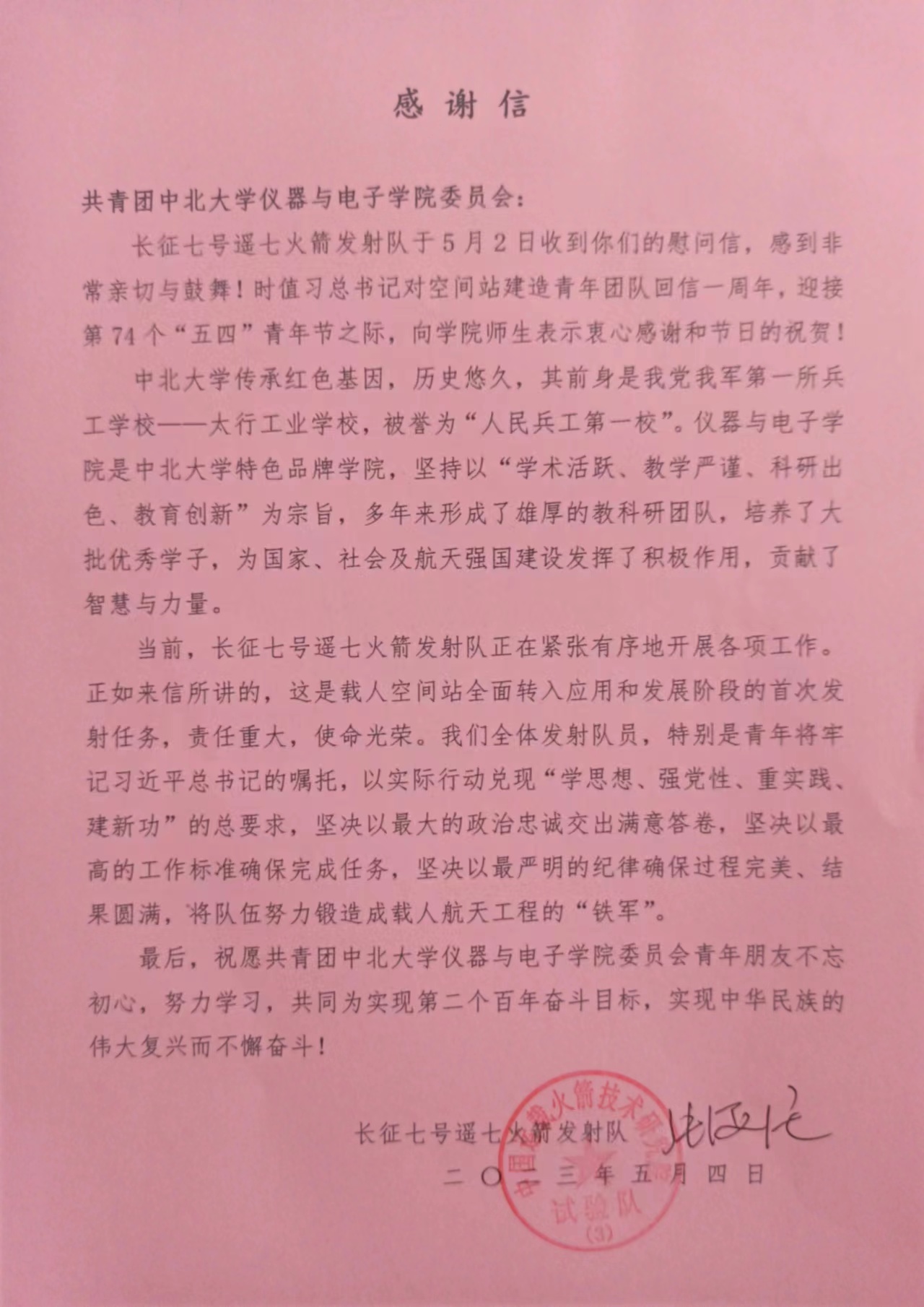 5月4日,在第74个“五四”青年节之际,时值习近平总书记对空间站建造青年团队回信一周年,仪器与电子学院团委收到来自长征七号遥七火箭发射队回信,向学院师生表达了节日的祝贺。