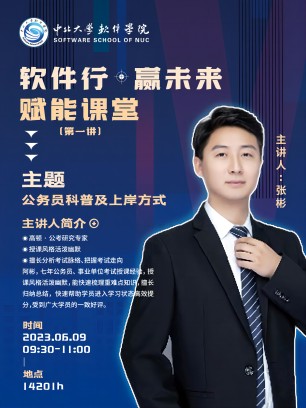 6月9日上午,在14号教学楼201H教室,“软件行·赢未来”赋能课堂第一讲开讲,主讲题目:公务员科普及上岸方式。学院特地邀请高顿教育公考研究专家张彬讲师授课,为大二、大三有考公考编意向的学生讲解辅导,帮助同学们建立正确的认知,做好充分的准备,掌握必要的技能和技巧。学院党委副书记兼副院长高宏图和就业辅导员乞国钰参加了课堂学习。