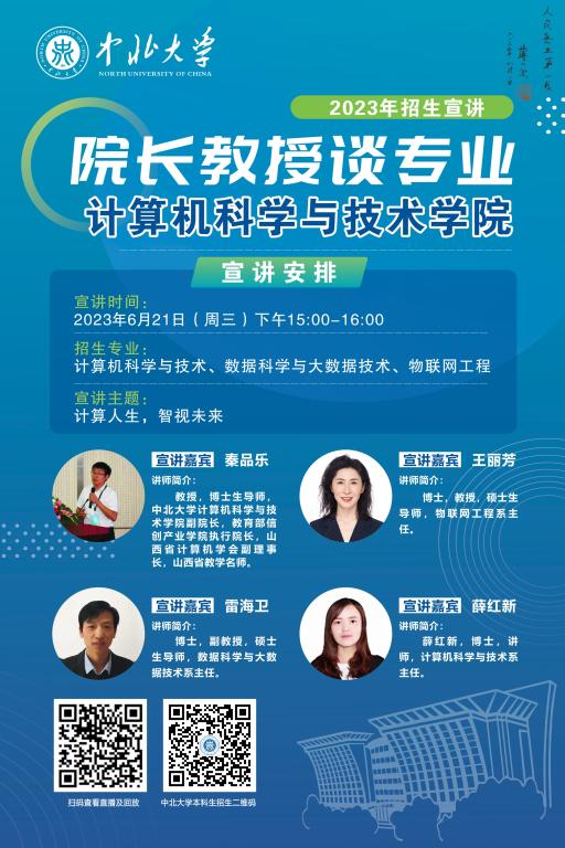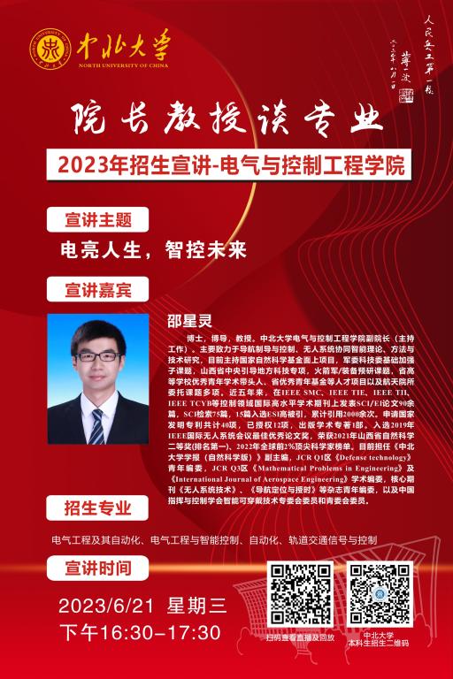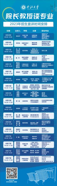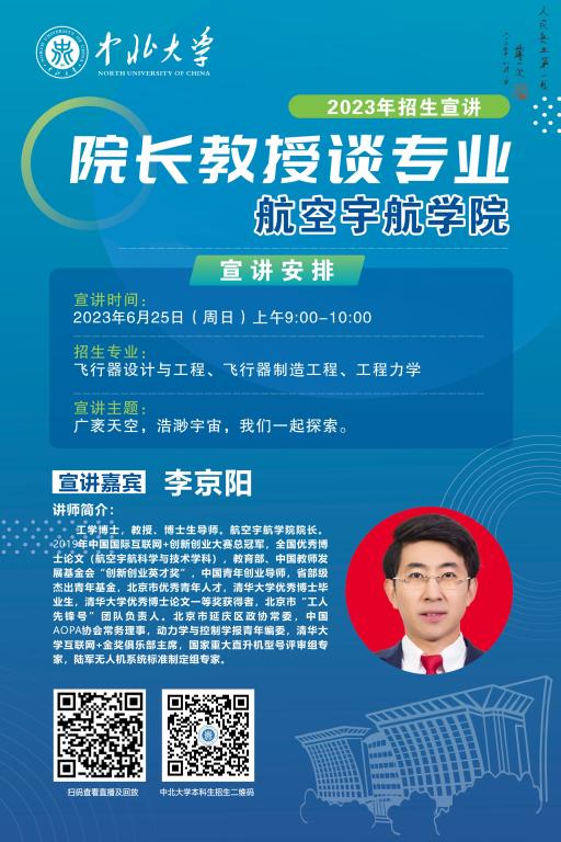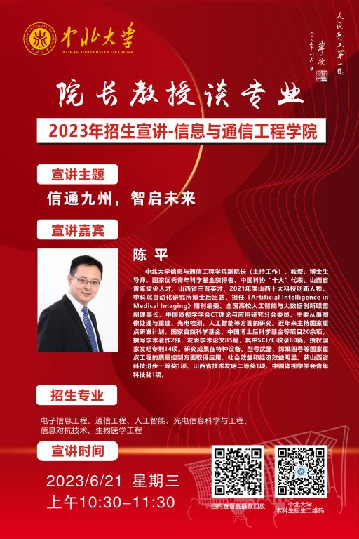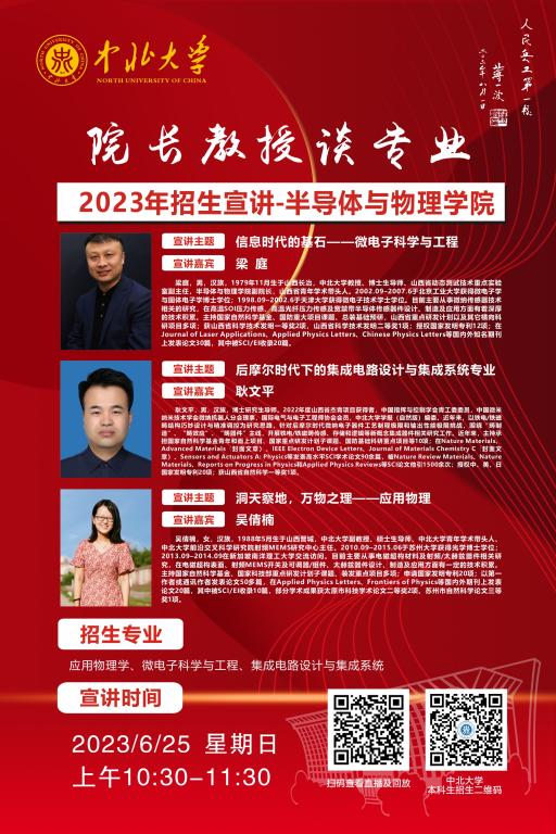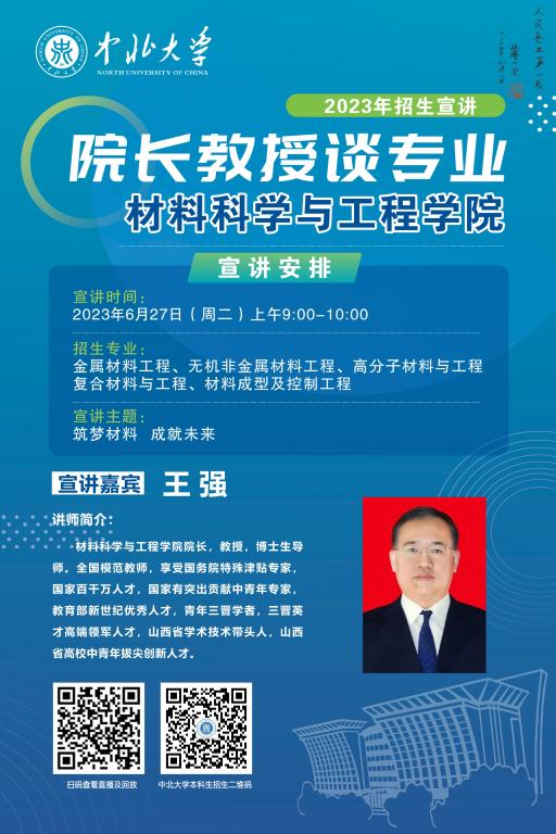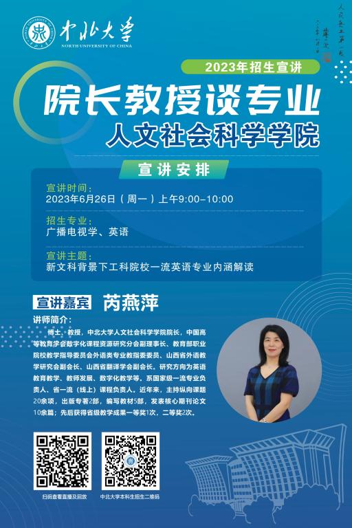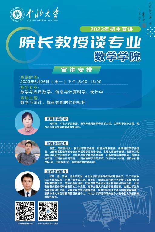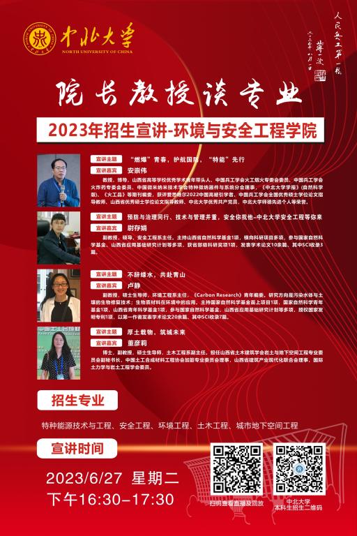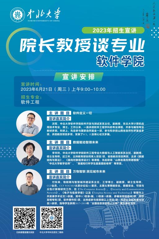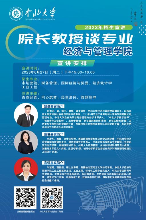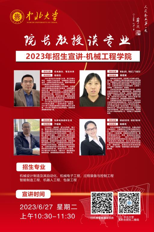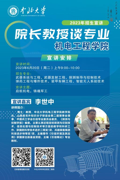 未来的大学学子们,你们已经完成了十二年寒窗苦读,完成了一次重要的人生答卷,即将开启人生新的征程。在这重要的人生十字路口,将会面临新的选择,为了让大家进一步了解中北大学,我们于6月20至27日特别推出 “院长教授谈专业”系列直播活动,由各院学术大咖们带你深入了解中北大学各专业情况,并现场与大家进行沟通交流,答疑解惑,一定记得届时扫码观看哦!