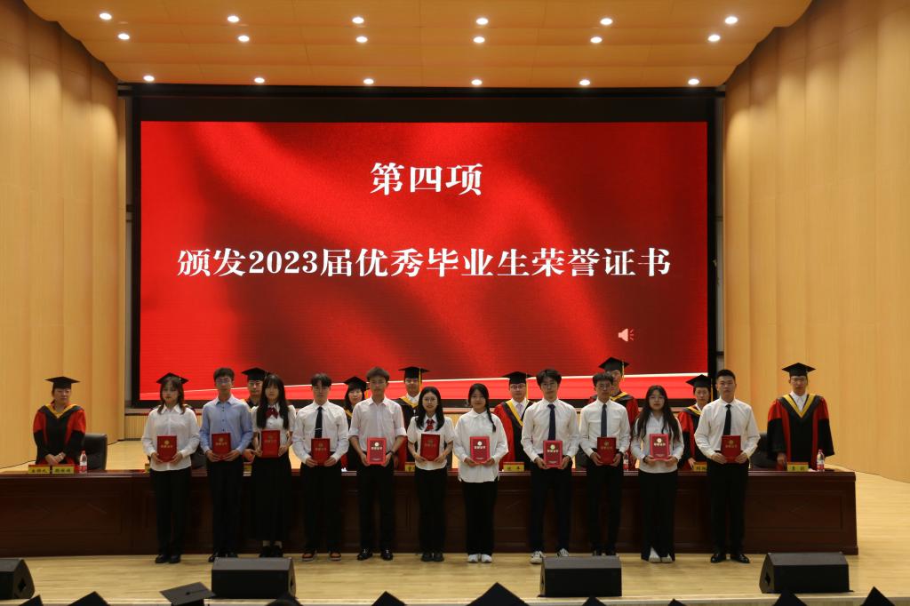 典礼在庄严的国歌声中拉开帷幕,学院院长陈平向顺利完成学业的2023届毕业生表示热烈的祝贺,并宣读“2023届优秀毕业生表彰决定”,副院长赵冬娥宣读“2023届毕业生校友导师”聘任决定,主席台领导为同学们颁发荣誉证书和聘书。