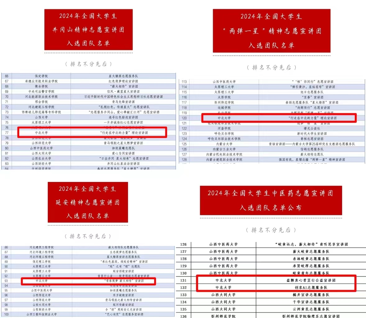 值得高兴的是“行走在中北的力量”理论宣讲团同时获得了2024全国大学生井冈山精神和“两弹一星”精神志愿宣讲团队入选资格。