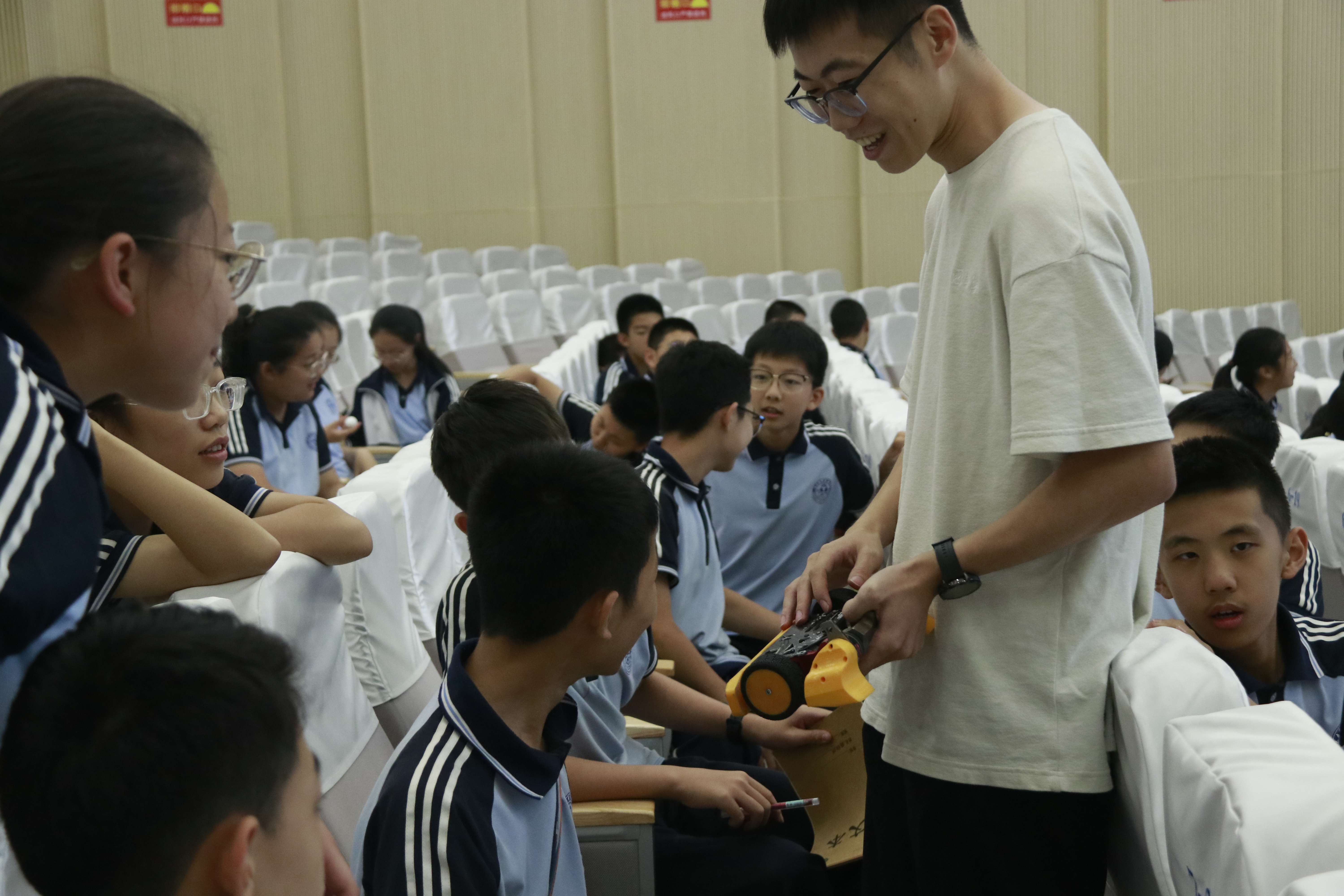 挂牌仪式后,王义老师向在场师生开展了题为“2024面向未来”主题讲座。他以展示实物机器人为起点,图文并茂的介绍了机械的发展演变,介绍了相关机器人比赛等专业知识、实践技能,并与在场学生积极互动,激发了学生们对机器人的兴趣,满足了学生们对机器人的好奇心。