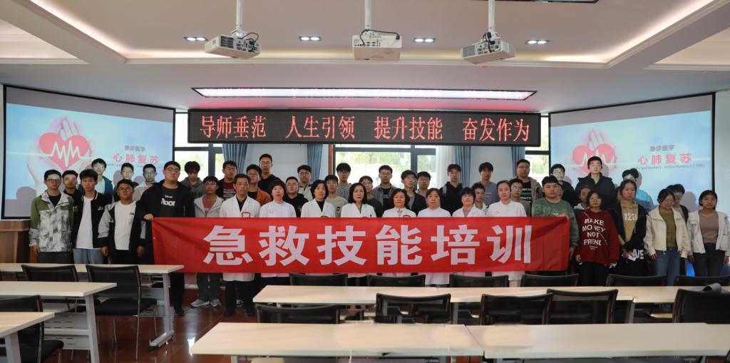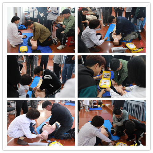 培训主要内容为徒手心肺复苏术及自动体外除颤仪(AED)的使用。医务人员首先为同学们讲述了心肺复苏术的基本理论知识、自动体外除颤仪操作流程、判断标准以及意外伤害的现场救护原则。告诉大家:在遇到突发情况时,要沉着冷静、从容应对、积极施救,要敢于施救、善于施救。要以“敬佑生命、救死扶伤”的精神和“大爱无疆、乐于助人”的道德操守全身心投入施救,与时间赛跑、与死神争夺,让生命在自己手中获得新生,让生命的价值和意义在经历获救后更加厚重和闪亮。接下来,医护人员手把手、面对面的教练同学们心肺复苏术的实际操作技巧和方法。医护配合分步骤进行现场实操演示,耐心讲解操作要领和注意事项。评估现场环境、判断患者意识、呼叫120急救电话、清理口腔异物、开放气道、口对口人工呼吸、胸外心脏按压…每一步环环相扣、每一步规范操作。同学们聚精会神听讲解、积极主动练操作,每个人都亲自动手实操,初步掌握了基本的心肺复苏术和应急救护技能。