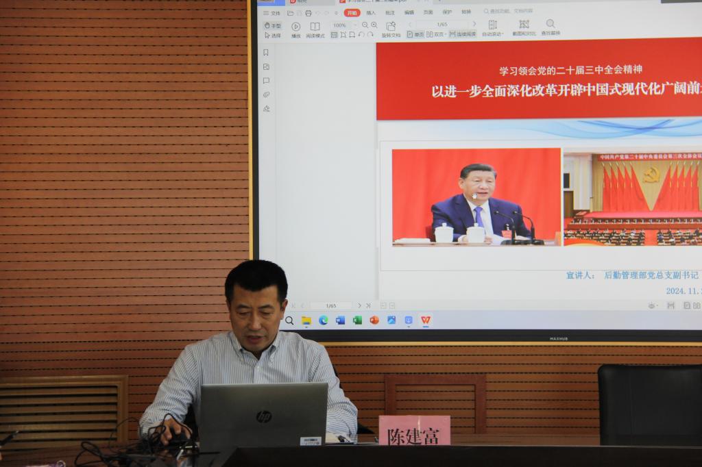 11月29日,后勤管理部党总支在部办公楼三层会议室召开了党的二十届三中全会精神宣讲会。此次会议由后勤管理部党总支副书记陈建富宣讲,旨在全面深入学习宣传贯彻党的二十届三中全会精神,引导广大党员干部群众把思想和行动统一到全会精神上来,汇聚起推进后勤服务保障工作高质量发展的强大合力。会议由后勤管理部党总支书记杨湖同志主持。