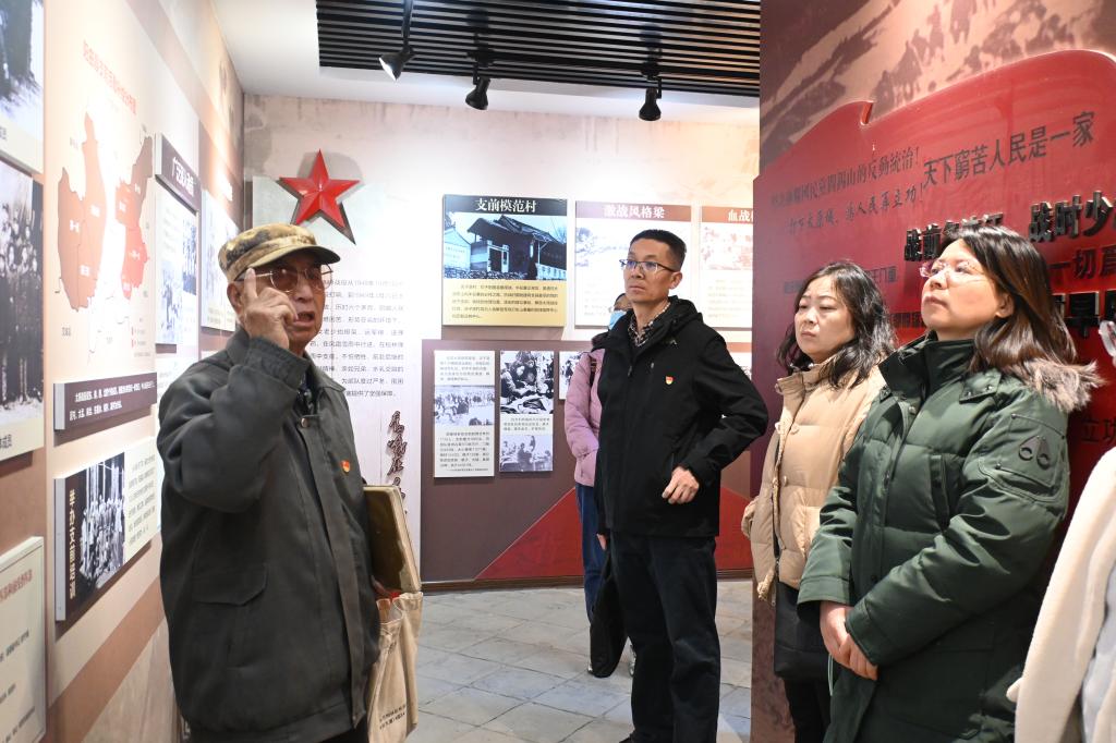 随后,大家来到支前纪念馆前,在庄严的党旗下重温了入党誓词,参观了支前纪念馆,并接受了老村支书的红色教育。纪念馆内设有三个展厅,分别展示了支前历史、革命文物和解放太原战役的相关资料。在纪念馆中,可以看到许多珍贵的历史照片和革命文物,如驮筐、驮架、盐磨子、水斗子等支前用过的实物,以及部队集结的命令、通知等历史文献,这些展品生动地再现了当时人民群众支援前线的场景,让人深感震撼。通过接受红色教育,大家更深刻了解了店子底村在解放太原战役中的重要地位和作用,以及当地人民为支援前线所做出的巨大贡献。这个历经烽火硝烟的小山村,用一场惊心动魄、彪炳史册的太原解放战争和一支可歌可泣、荡气回肠的“支前”战歌,向世人诉说了红色文化的伟大传承。