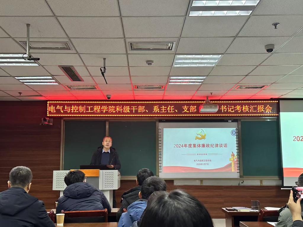 沉淀过往,序启新章。根据学校关于对科级干部、党支部书记考核的通知精神,为了更好地总结2024年度党建思政、教学科研、管理服务等各项工作的完成情况,2025年1月7日下午,电气与控制工程学院在11号楼815会议室举行2024年度述职评议考核大会。学院科级干部、系主任及党支部书记参加了本次述职评议考核。院领导班子、党委委员、科级干部、支部书记、系主任、教师代表、党外人士代表担任评委。大会由学院党委副书记杜瑞平主持。
