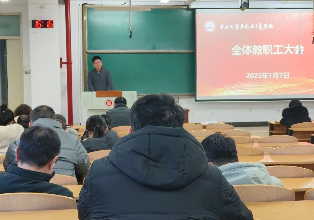 院长赵笑蕾从人才引育、思政课建设、科学研究、学生培养和社会服务等方面盘点了2024年度学院亮点工作以及各项工作取得的成绩。赵院长指出,学院引进5名青年博士,为中北大学马克思主义学院不断注入新鲜血液;学院学生获得第十四届“挑战杯”中国大学生创业设计竞赛铜奖;学院教师在山西省首届场馆育人讲解大赛中共创佳绩;学院教师成功立项教育部人文社科项目和多项省部级科研项目,发表多篇高水平学术论文,出版多部专著;积极开展党的二十届三中全会理论宣讲工作。赵笑蕾院长从名师工作室创建、百亿工程揭榜挂帅、科研项目申报、学科评估等方面对学院下一年工作进行展望,对存在的主要问题进行了分析并提出了改进要求,希望全体教职员工能继续携手同行,凝聚智慧与力量,服务学校“双一流”创建,谱写马克思主义学院发展新篇章。