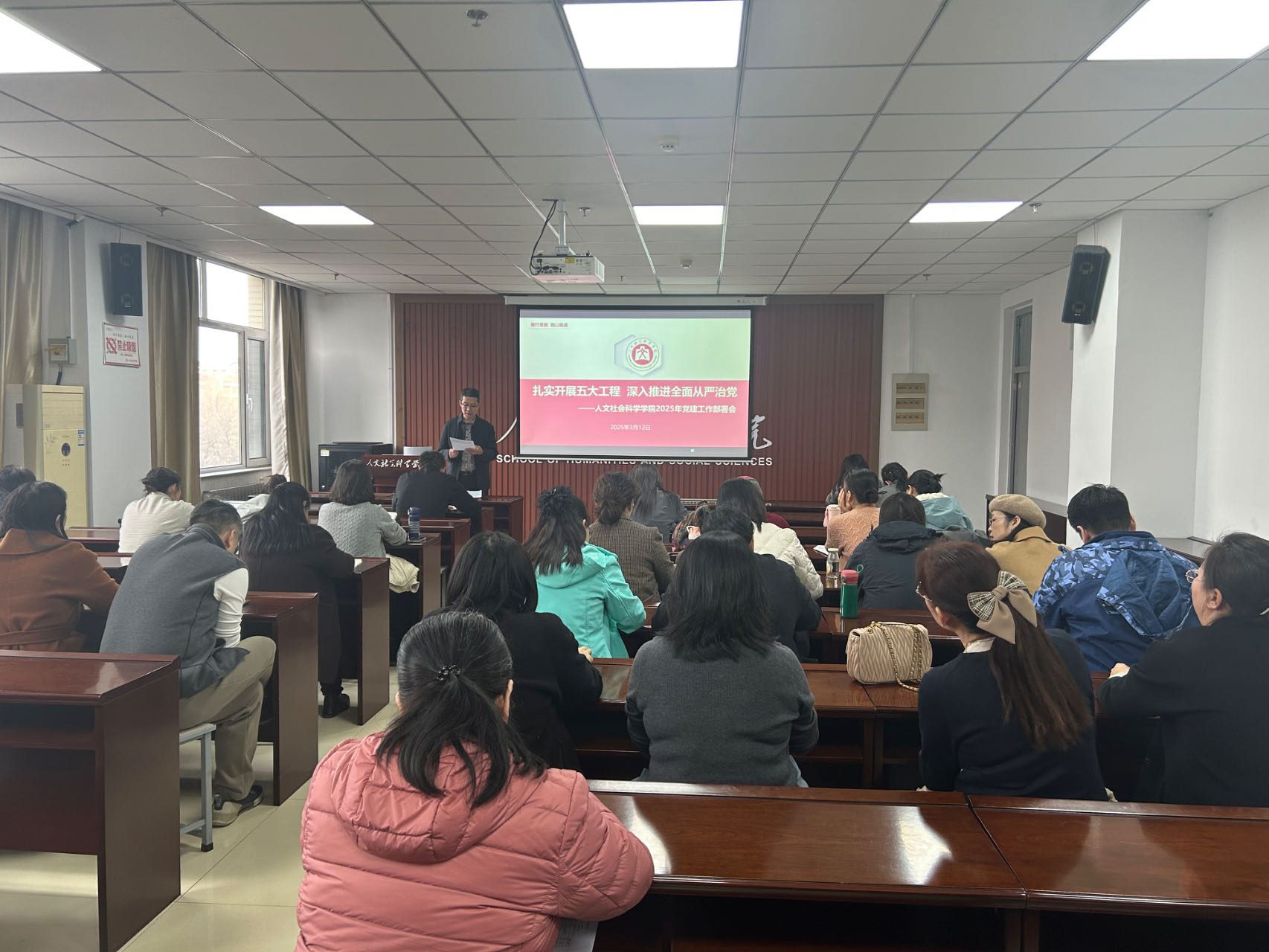 为认真贯彻党的二十大、党的二十届三中全会精神,深入推进全面从严治党,落实学校党建工作要求,推动学院事业高质量发展,3月12日,人文社会科学学院召开了 2025 年度党建工作部署会。学院全体教工党员齐聚一堂,共同谋划新一年党建工作蓝图。会议由院党委书记孙俊伟同志主持。