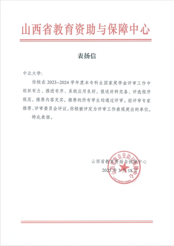 3月18日,我校收到山西省教育资助与保障中心表扬信,表扬我校在2023-2024学年国家奖学金评审工作中组织有力、推进有序、系统应用良好,报送材料完备、评选程序规范,推荐内容充实,推荐的所有学生均通过评审。至此,我校已连续两年被评定为评审工作表现突出的单位。